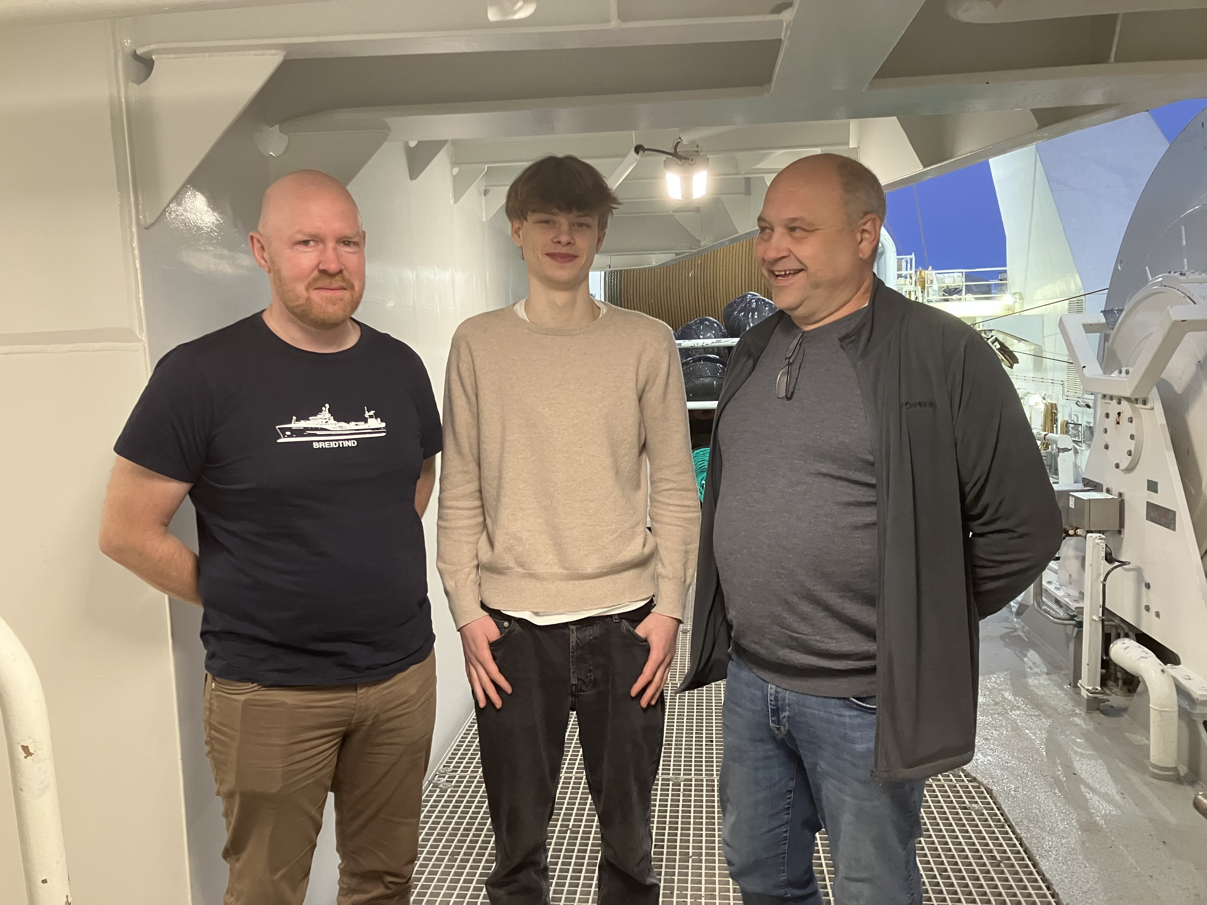 Overstyrmann Kurt-Johan Kildahl og skipper Kurt Steinar Bendiksen på Breidtind tar i mot Elias Tårnes Guttormsen (18) på sin første tur. Foto: Annbjørg Reiersen